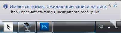 В панели быстрого запуска можно почитать сообщение о том, что у нас имеются файлы, которые ожидают записи на диск (можно нажать на это сообщение, чтобы у вас появилась папка с добавляемыми файлами).