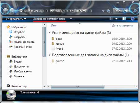 Для этих случаев в Windows 7 существует стандартная утилита. Допустим, у меня уже есть болванка с информацией, и я хочу записать на нее папку с фотографиями.