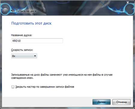 В следующем окошке указываем название диска и скорость записи и жмем кнопку «Далее».