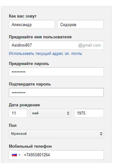 Теперь заполняем все важные поля. А именно, «Как вас зовут» - «Имя» и «Фамилия». «Имя пользователя», это уникальный логин, который нужно ввести латинскими буквами и цифрами, также это будет ваш email. Например, если ввести «Asidirov857», то ваша почта будет [email protected]