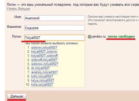 Теперь в поле «Имя» и «Фамилия» вводим свое имя и фамилию, русскими или английскими буквами. Не обязательно вводить правду, можно не запоминать эти поля, их потом все равно при желании можно сменить. А вот поле «Логин» очень важное, это и будет ваш адрес, его вводим только раз. Логин должен состоять из латинских символов, цифр, одинарного дефиса или точки, начинаться с буквы и заканчиваться буквой или цифрой и содержать не более 30 символов. Еще ваша придумка кем-то может быть занята, поэтому, скажем логин «Tolya» уже занял какой-то человек, подбираем свободный, например «Tolya0927» - справа появиться надпись «Логин свободен» После чего, записываем где-то придуманный логин и жмем «Дальше»