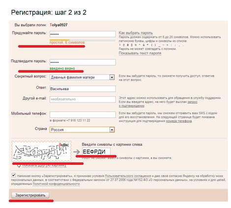 Следующее окно, продолжаем заполнять данные. Поле «Придумайте пароль» тоже очень важное, минимальный пароль может быть из 6 цифр, или латинских букв. Его как и логин запишите где-то и не забывайте! В поле «Подтвердите пароль» еще раз введите придуманный пароль. «Секретный вопрос» - это подсказка в случае утери пароля, самое простое, это выбрать «Девичья фамилия матери» Поле «другой e-mail» и «Мобильный телефон» оставляем пустым по желанию.