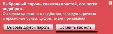 Если ваш пароль простой выскочит окошко с предупреждением, нажимаем «Оставить как есть» если вы не боитесь, что кто-то взломает вашу почту и прочтет переписку
