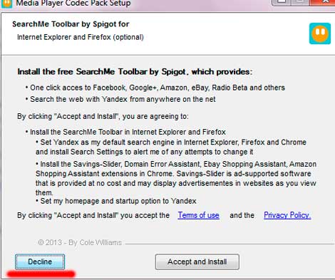 А вот в 3-м окне нам предложат установить какой-то поисковик. Нажимая «Decline» вы отказываетесь его устанавливать. Я сделал так, мне лишнее не нужно.