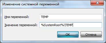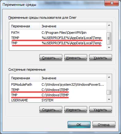 В разделе «Системные переменные» находим две переменных TEMP и TMP и меняем путь при помощи кнопки «Изменить».