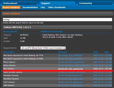 Переходим на сайт http://dd-wrt.com/site/support/router-database. Вбиваем в поле поиска «wrt54gl» и скачиваем файл «dd-wrt.v24_mini_generic.bin»