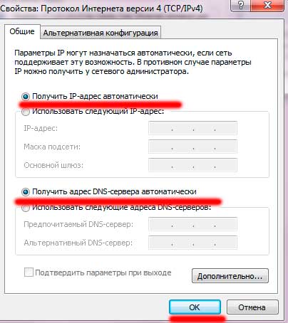 Во вкладки «Общие» ставим переключатели на «Получать IP-адрес автоматически» и «Получить адрес DNS-сервера автоматически», после чего нажимаем «ОК» 2 раза