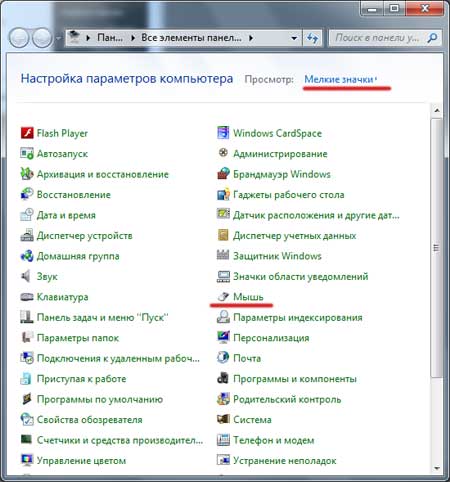 Далее ставим «Просмотр: Мелкие значки» и выбираем пункт «Мышь».