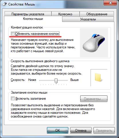 Во вкладке «Кнопки мыши» необходимо поставить флажок «Обменять назначение кнопок».