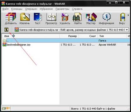 Для этого открываем архиватором поврежденный архив, жмем на стрелочку, чтобы открылись все функции (как показано на скриншоте).