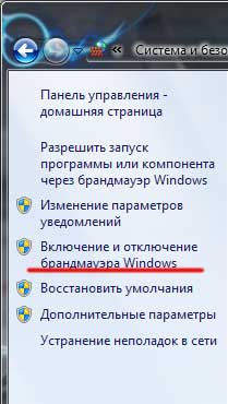В следующем окошке в левой колоночке кликаем по ссылке «Включение и отключение брандмауэра Windows».