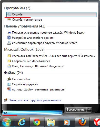 Далее нам необходимо отключить службу, которая отвечает за брандмауэр. Для этого жмем «Пуск» и в строке поиска пишем «сл», у нас сразу выдается результат «Службы». Кликаем по нему.