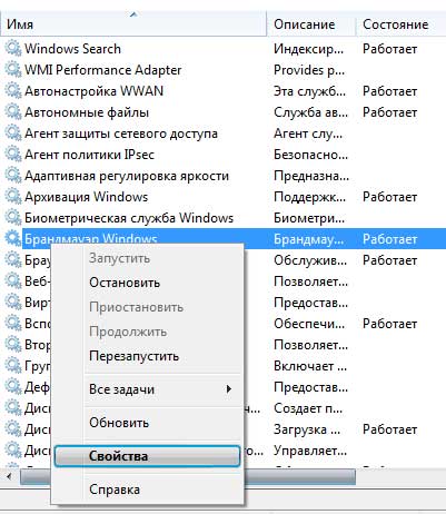 У нас открываются все службы, находим службу «Брандмауэр Windows» и кликаем по ней правой кнопкой мыши и выбираем пункт «Свойства»