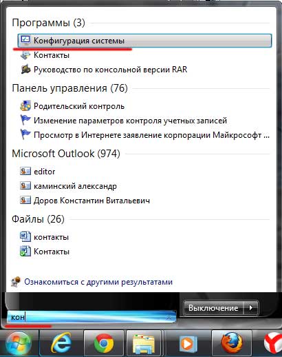 Это еще не все. Жмем опять кнопку «Пуск» и пишем «кон». Нам выдался результат: «Конфигурация системы». Кликаем по нему.