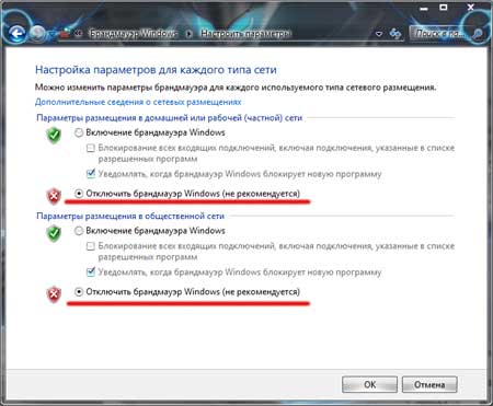 Далее в следующем окошке ставим переключатель в положение «Отключить брандмауэр Windows», как это показано на скриншоте и жмем кнопочку «ОК».