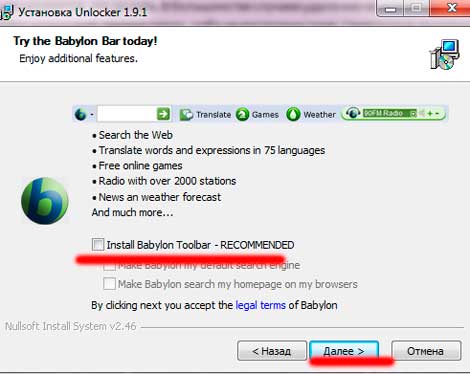 Нажимаем один раз далее, принимаем лицензионное соглашение. И тут вылезет реклама «Try the Babylon Bar today!» Снимаем все галочки, чтобы не установить этот тулбар себе в браузер.