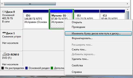 Здесь показаны все разделы нашего жесткого диска, в том числе и съемные диски. Находим нашу флешку и кликаем по ней правой кнопкой мыши и из выпавшего списка выбираем пункт «Изменить букву диска или путь к диску». Меняем букву диска на любую другую, которой еще нет.