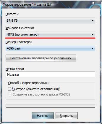 Далее выбираем в следующем окошке файловую систему NTFS и нажимаем кнопку «Начать».