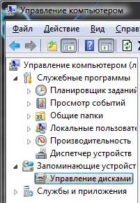 В открывшемся окне под названием «Управление компьютером» идем по пути «Запоминающиеся устройства – Управление дисками».