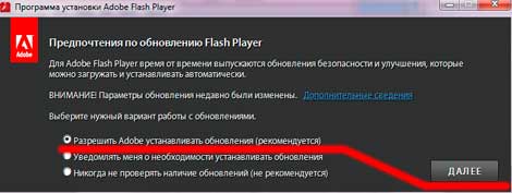 На вопрос программы об обновлениях оставляем по умолчанию «разрешить Adobe устанавливать обновления» и жмем «далее»