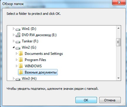 Ищем месторасположение нашей папки, на которую нужно поставить пароль, выделяем ее, жмем «ОК»
