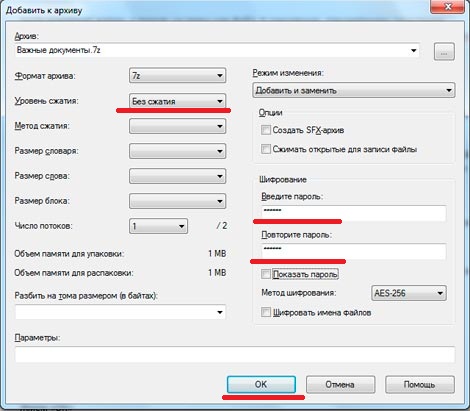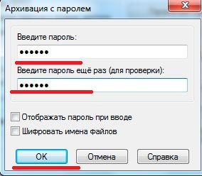 Высветиться окошко «Архивация с паролем». Вводим, придуманный пароль в первую строчку и во вторую.
