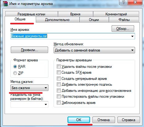 Если сжимать информацию не нужно, и для того, чтобы сэкономить время переходим во вкладку «Общие», выбираем Метод сжатия: «Без сжатия». Если нужно сжать, то не делаем данных действий.
