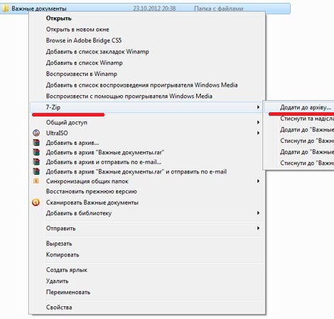 Выделяем папку или файл, на который хотим поставить пароль, и жмем правую кнопку мышки. Выбираем строчку «7-zip», жмем «Добавить к архиву» или «Add to archive»