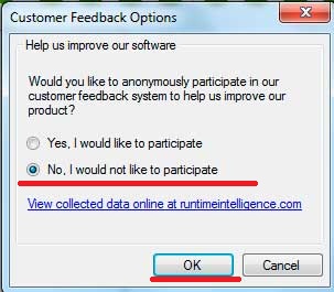 В окошке «Customer Feedback Options» я выбрал «No, I would not like to participate» и нажимаем «OK»