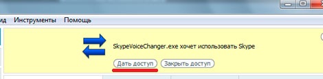 Переходим в сам Skype и сверху высветиться запрос «SkypeVoiceChanger.exe хочет использовать Skype», жмем «Дать доступ»