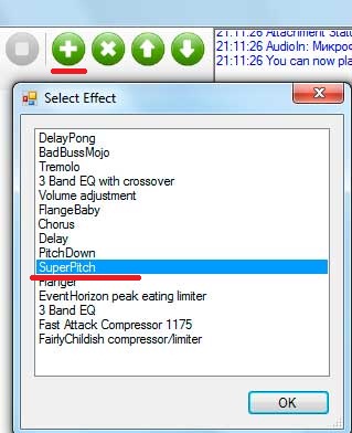 Снова переходим в программу. Нажимаем зеленый кружочек с белым плюсиком «Add Effect». Перед нами выйдет список из возможных эффектов. Достаточно «смешной» на мое усмотрение «SuperPitch» Выбираем его, жмем «OK»
