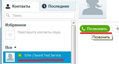 Теперь нужно кому-то позвонить, если хотите послушать сами, что получиться, перезвоните контакту «Echo/Sound Test Service». Этот контакт есть у всех пользователей скайпа, хотя многие даже не понимают, зачем он.