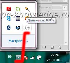 Пропал значок громкости в windows 7. Для начала проверим, нет ли его в скрытых значках. Для этого нажмем на треугольник возле переключателя языка.