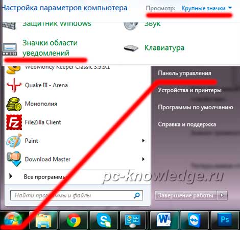 Теперь жмем «пуск» - «панель управления». Справа сверху выбираем «просмотр: Крупные значки». Далее находим пункт «Значки области уведомлений» и нажимаем на него.