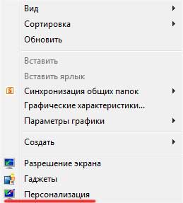 И так для начала попробуем сделать следующее (Данный способ подойдет для Windows Vista и 7). Кликаем правой кнопкой мыши по рабочему столу из выпавшего меню выбираем пункт «Персонализация».