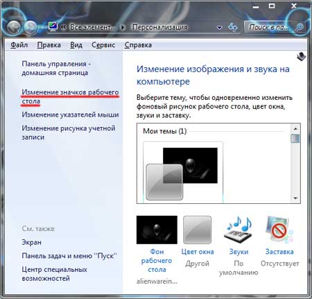 У нас открывается окошко, в котором необходимо выбрать пункт в левой колонке «Изменение значков рабочего стола».