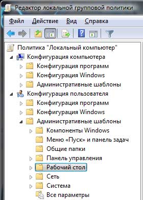 В редакторе локальной групповой политике идем по следующему пути «Конфигурация пользователя-Административные шаблоны-Рабочий стол»