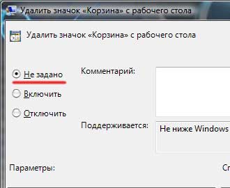 В правой части окна ищем строчку «Удалить значок «Корзина» с рабочего стола». Кликаем по нему два раза левой кнопкой мыши.