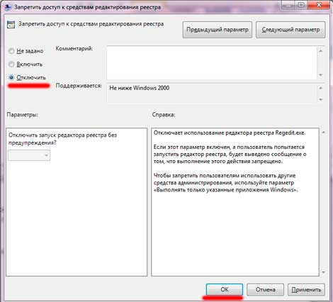В правом окне опускаем ползунок вниз на строку «Запретить доступ к средствам редактирования реестра», жмем два раза на этой строчке, или нажимаем «изменить параметр политики»