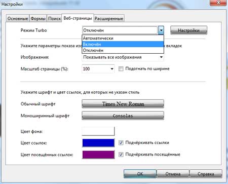 В открывшемся окошке переходим во вкладку Веб-страницы. Находим там раздел «Режим Turbo» и напротив из выпадающего списка выбираем то что нам нужно. В данном случае – это «Включен». Не забываем нажать на кнопочку «ОК».
