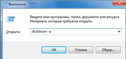 Но вдруг, наши планы поменялись и нам нужно отменить данное действие. Для этого, там же, где вводили команду выключения, пишем следующее «shutdown -a»