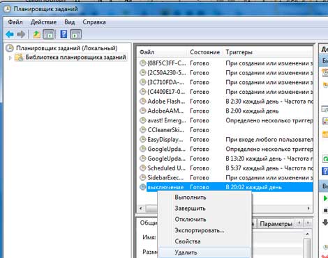 Нажимаем «далее» и «готово». Программа запущенна. Удалить задание можем следующим образом. Запускаем планировщик, нажимаем на «библиотека планировщика заданий» и в среднем столбике увидим наше задание. Правой кнопкой мышки по нему и «удалить»