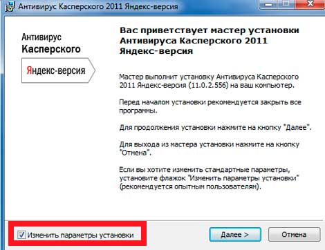 Перед тем, как запустить скачанный файл, рекомендую удалить все предыдущие версии антивирусного программного обеспечения. Не уживаться вместе два антивирусника. После, запускаем инсталлятор. В первом окне ставим галочку «Изменить параметры установки» и нажимаем кнопку «далее»