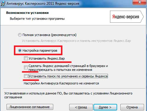 В следующем окошке лицензионное соглашение, жмем «Я согласен». Обратите внимание на 3-е окно. По умолчанию галочка стоит на «полная установка», но при этом, кроме Касперского будут установлены Яндекс.Бар, поиск по умолчанию и домашняя страница Yandex. Чтобы отключить это, жмем «Настройка параметров» и снимаем эти галочки. После чего, жмем «далее»
