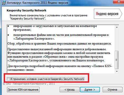 4-е окошко установки, похожее на еще одно лицензионное соглашение, но это не совсем так. Тут нам предлагают помочь лаборатории Касперского и присылать им всю информацию о вирусах, запускаемых программах, и прочей ерунды с вашего компьютера, которую можно прочитать там. Снимаем галочку с «Я принимаю участие в Kaspersky Security Network» и нажимаем «далее»