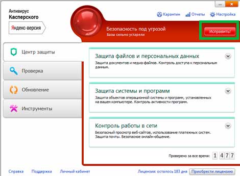 Откроется окно настроек программы. В первом же меню «Центр защиты» будет надпись на красном фоне «Безопасность под угрозой, базы сильно устарели». Жмем «Исправить»