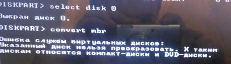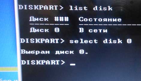 Нам нужно его все равно выбрать его. Для этого вводим команду «select disk 0», и жмем «Enter» ,если он не 0 а другой, вводим соответствующую цифру. Высветиться надпись «Выбран диск 0»
