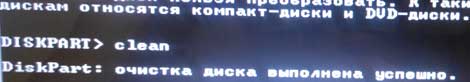 Вводим команду «clean». Она полностью очищает весь жесткий диск, удаляет разделы и все данные, вместе с файловыми системами.