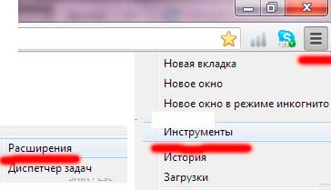Решением проблемы в данной ситуации является подключение специального расширения. Если впервые сталкиваетесь с ними, не пугайтесь, все очень просто. Вверху справа экрана, под крестиком нажимаем значок настроек, в открывшимся списке переходим к пункту «инструменты», а потом «расширения»