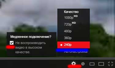 Для смены качества нажимаем колесико, справа снизу ролика, переключаем на ухудшенное качество, вплоть до «240p» и ставим галку «Не воспроизводить видео в высоком качестве»